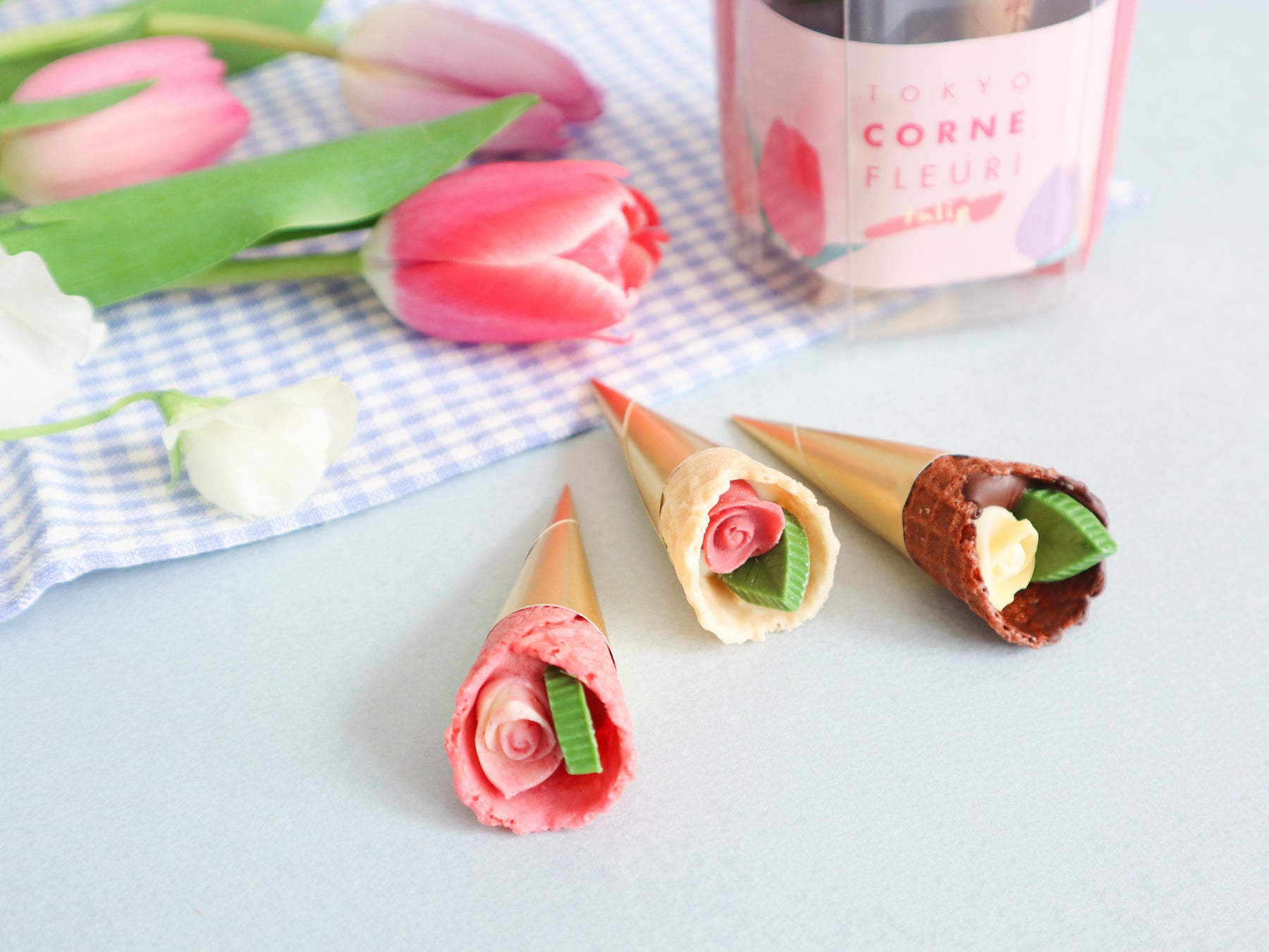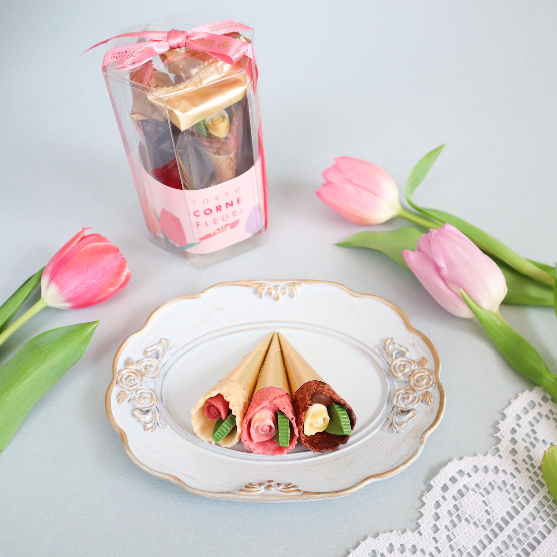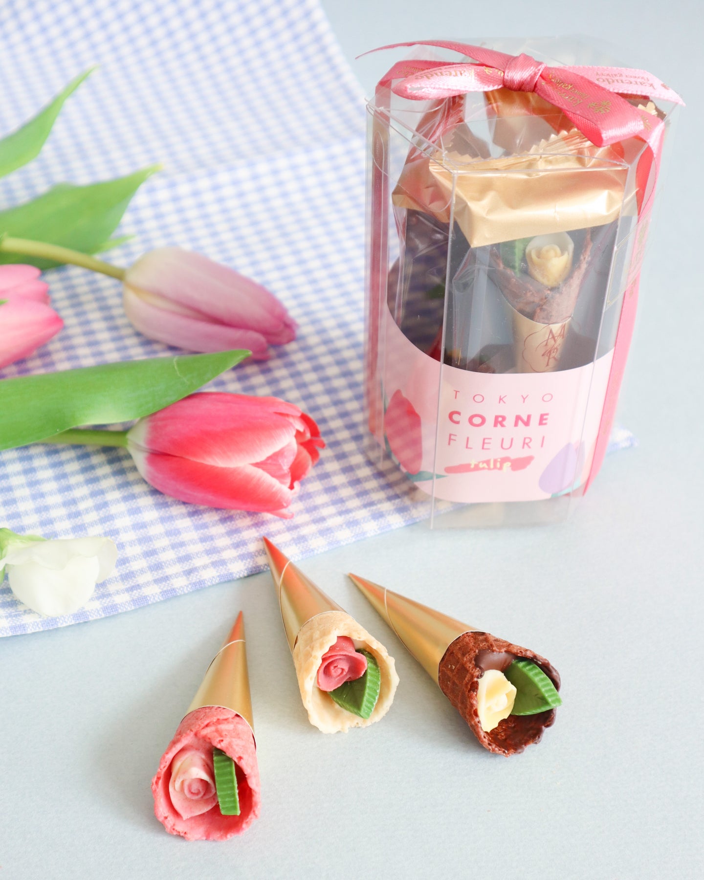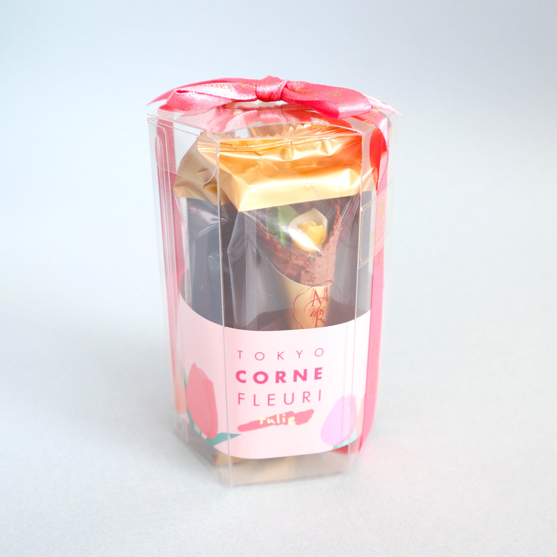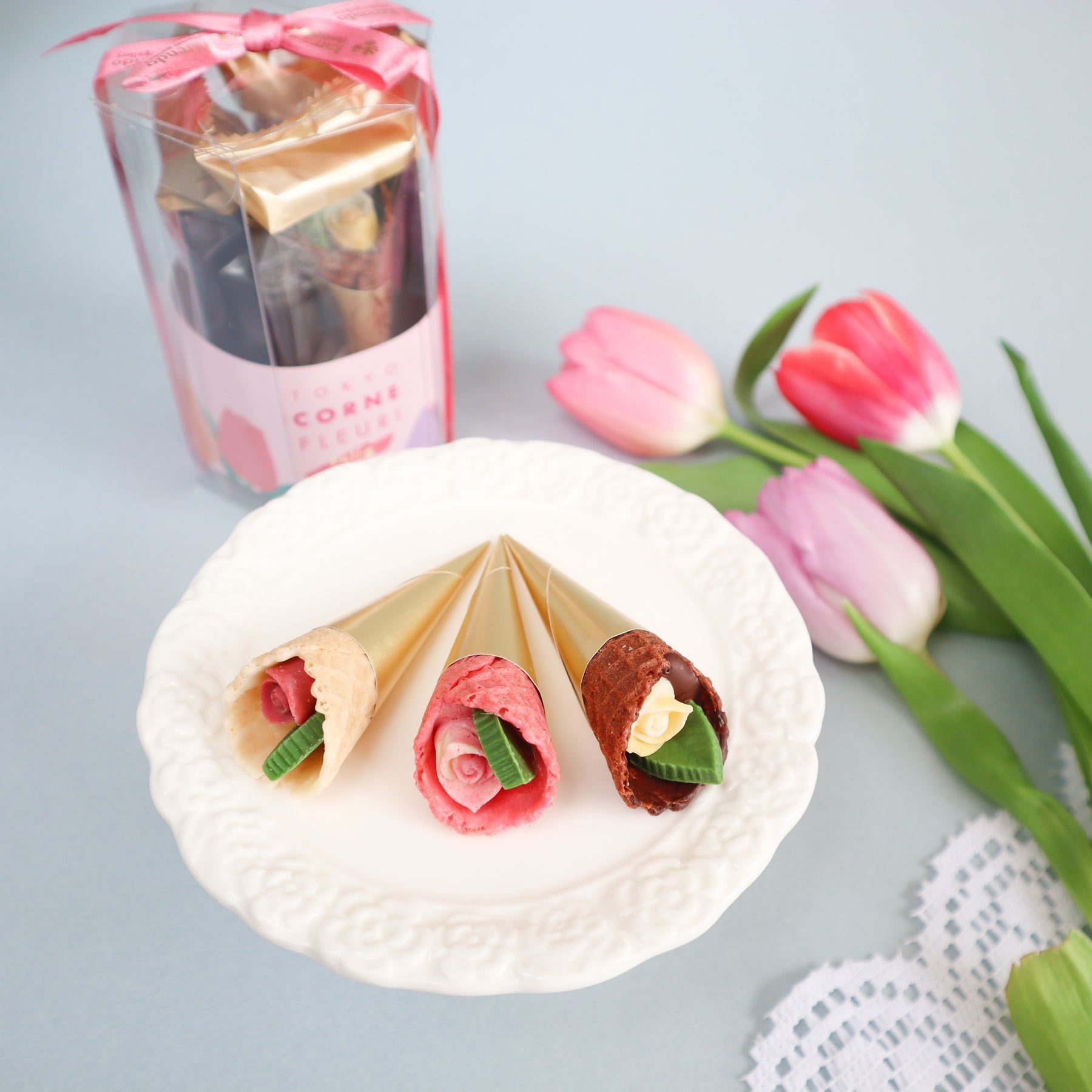春の訪れを感じさせるお花“チューリップ”にインスパイアされた華やかなチョコレート。こだわりのザクザク食感のコーンに、小さなバラとリーフのチョコレートを包み込んだ、まるで花束のようなチョコレートです。