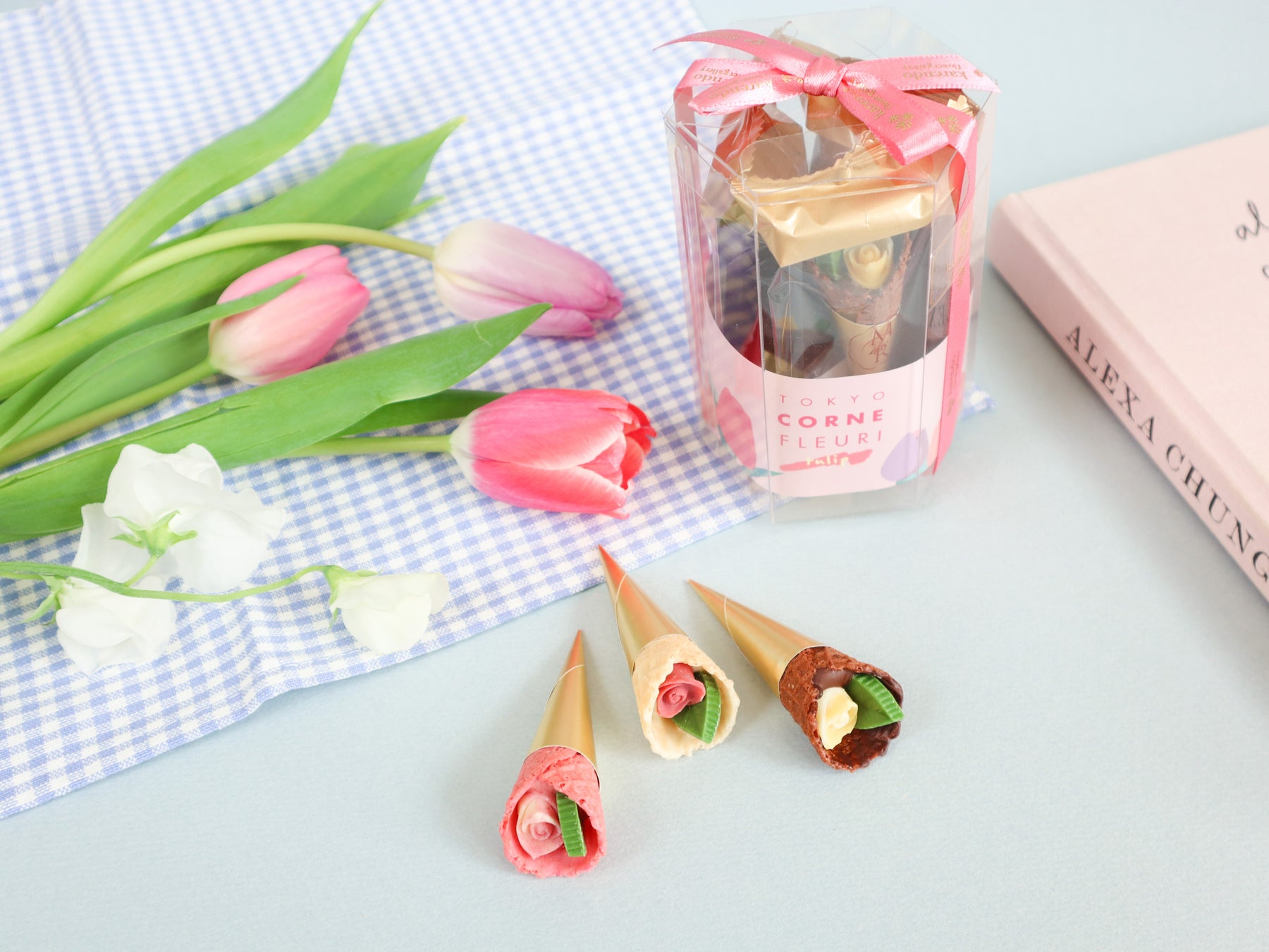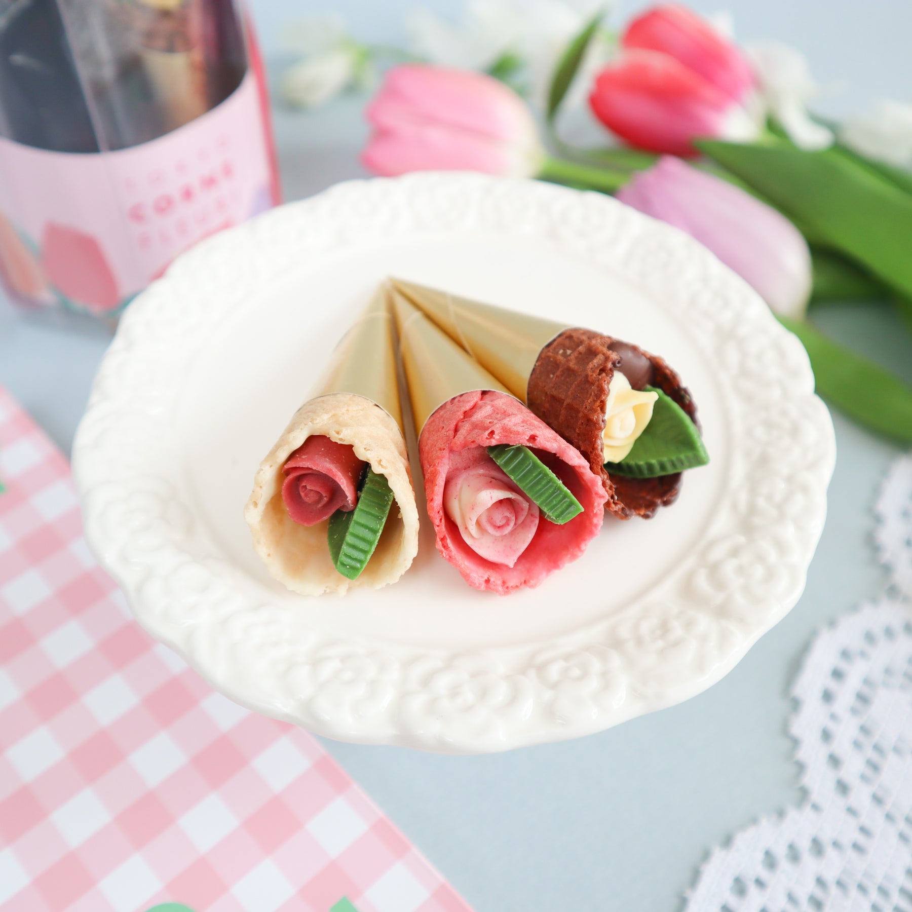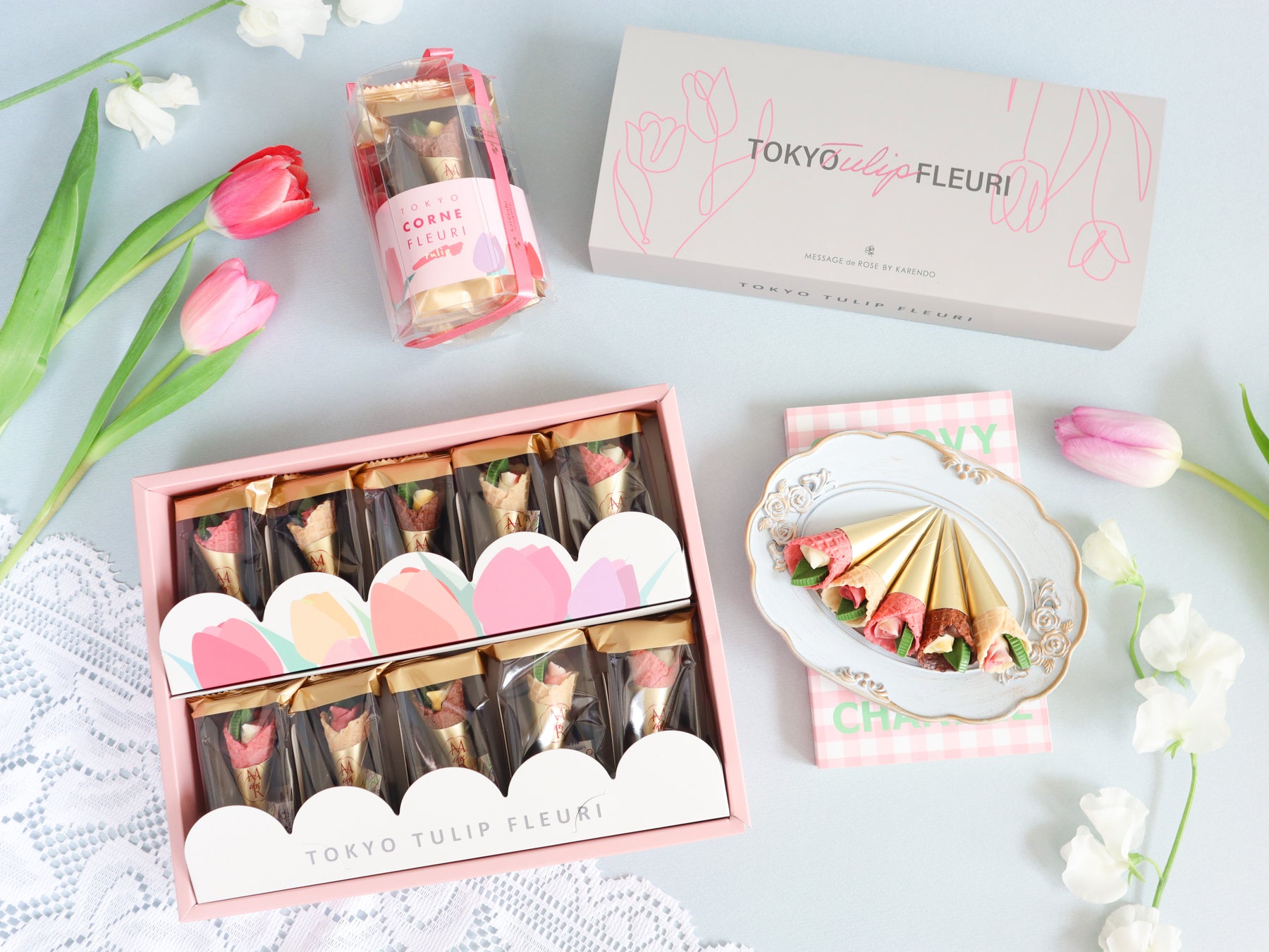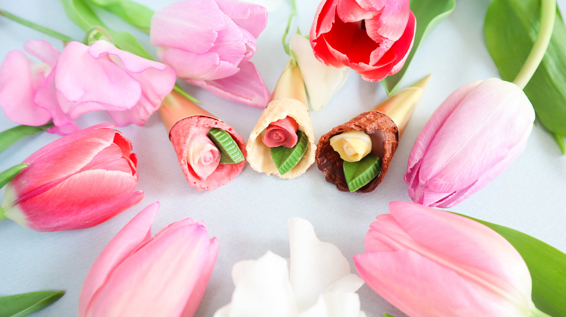 春の訪れを感じさせるお花“チューリップ”にインスパイアされた華やかなチョコレート。こだわりのザクザク食感のコーンに、小さなバラとリーフのチョコレートを包み込んだ、まるで花束のようなチョコレートです。