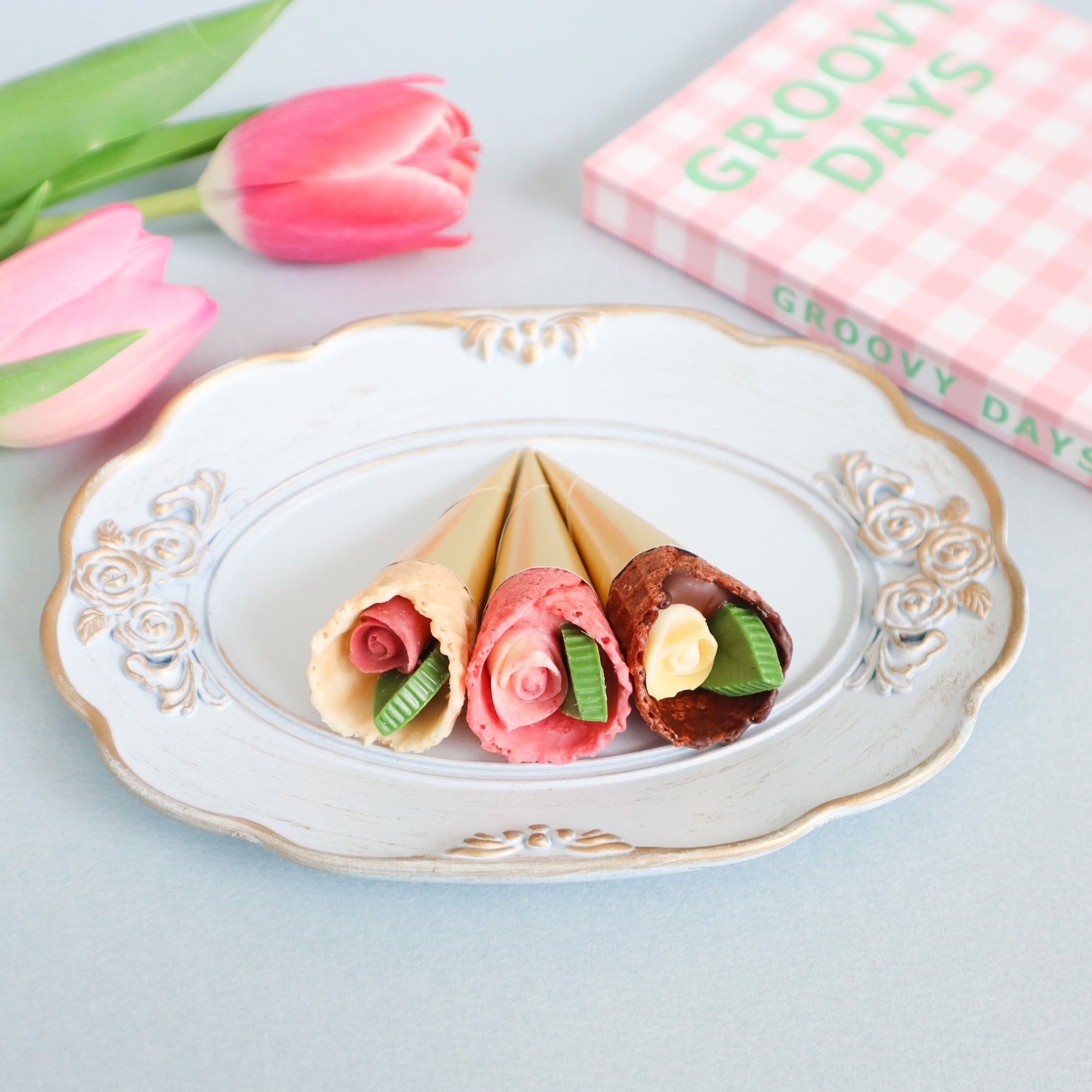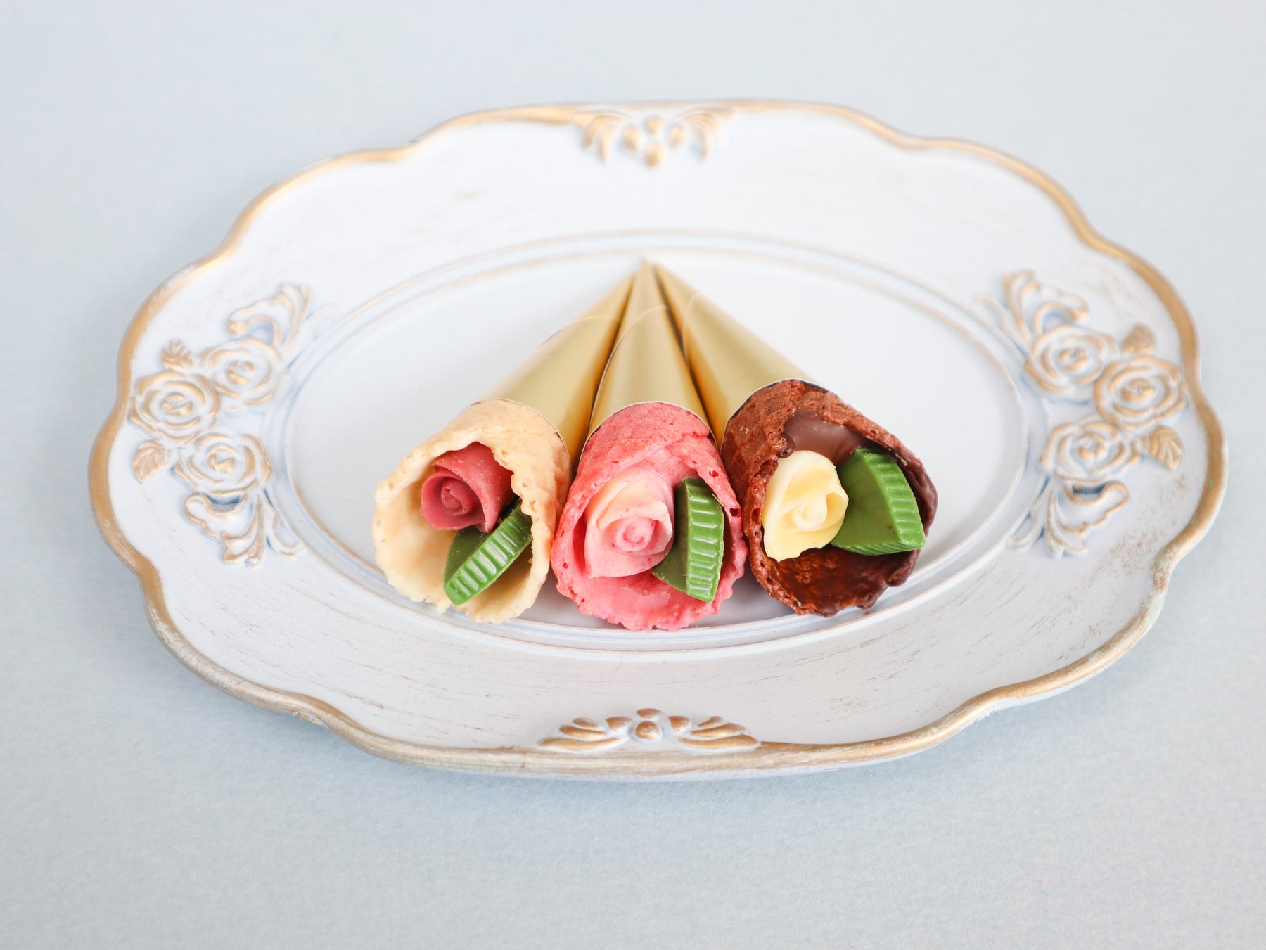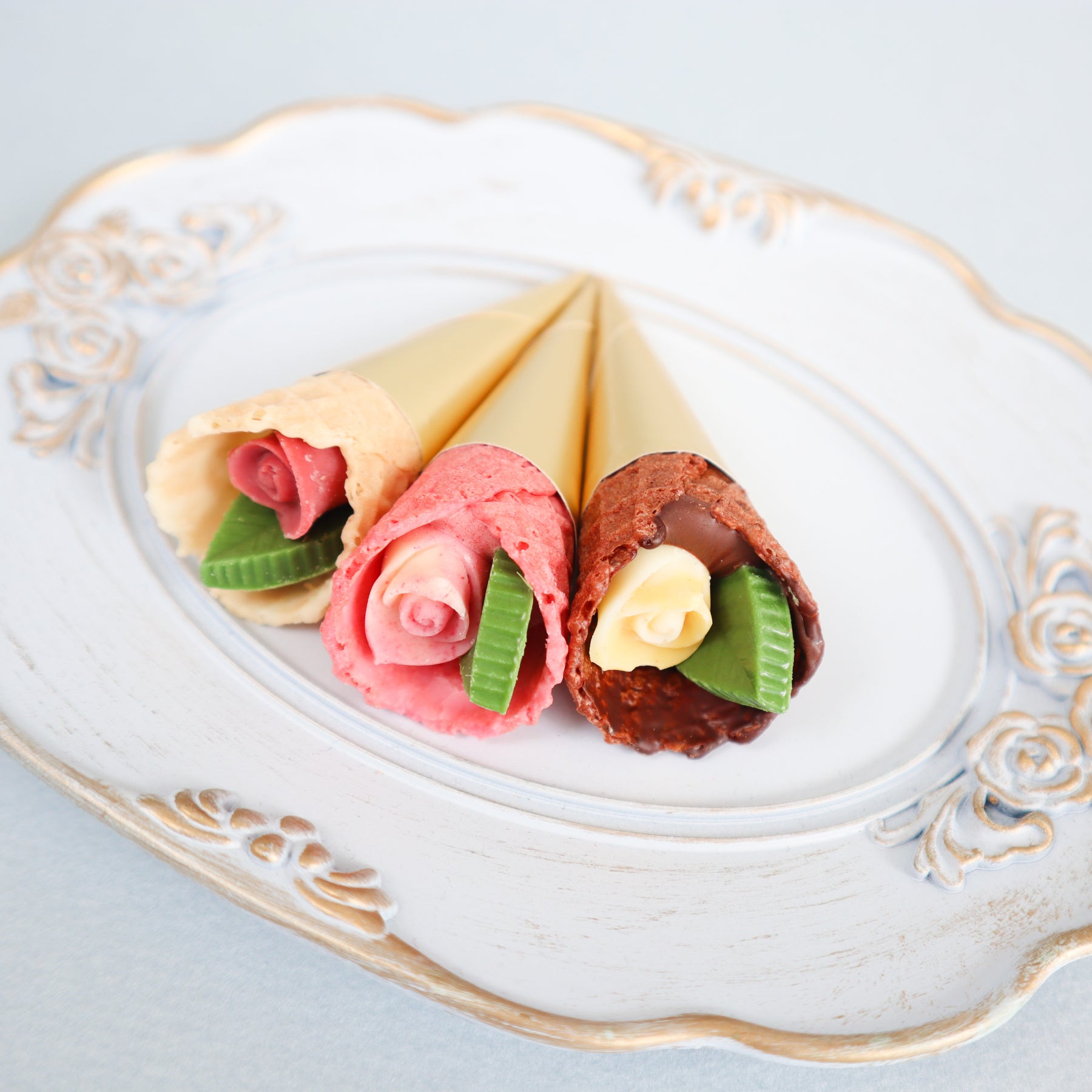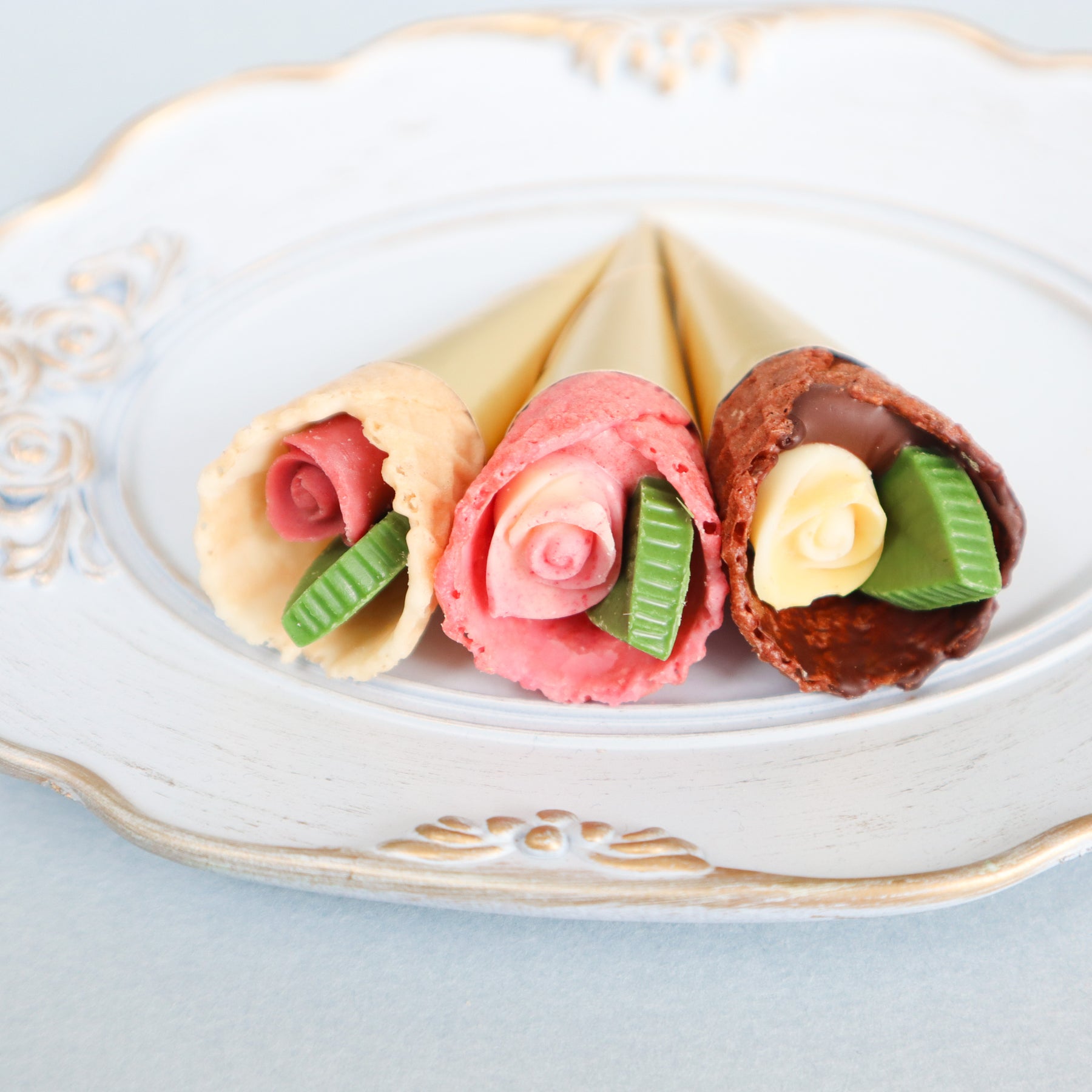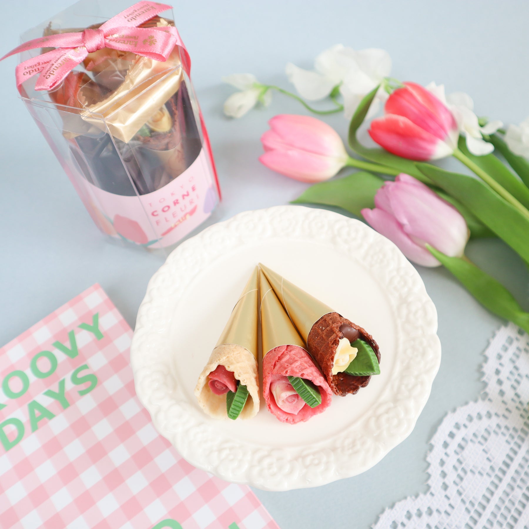 春の訪れを感じさせるお花“チューリップ”にインスパイアされた華やかなチョコレート。こだわりのザクザク食感のコーンに、小さなバラとリーフのチョコレートを包み込んだ、まるで花束のようなチョコレートです。